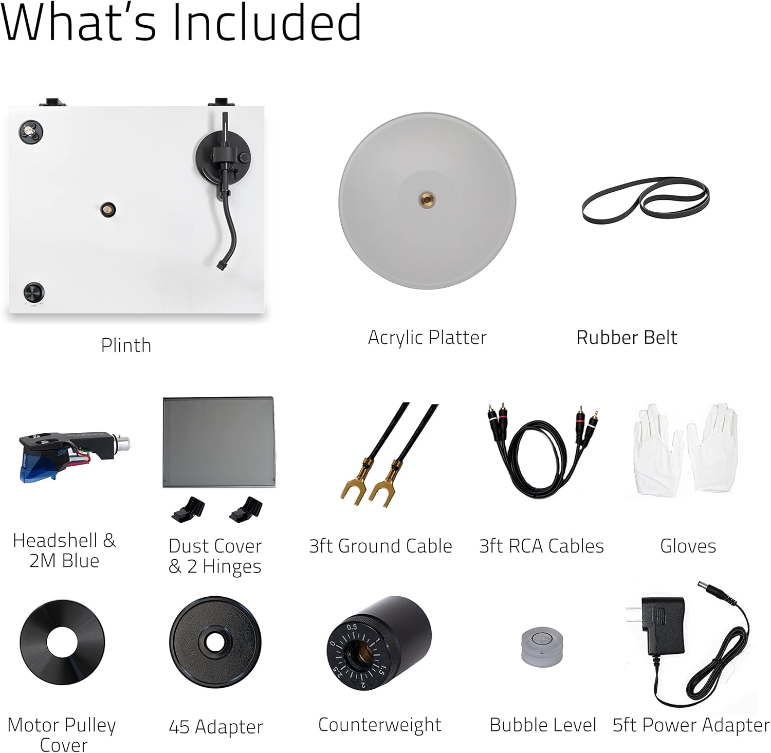 Includes dust cover, headshell, counterweight, acrylic platter with belt, RCA cable, ground wires, 45 RPM adapter, bubble level, and cotton gloves for a professional setup. Dimensions: Item weight 7.6 kg.