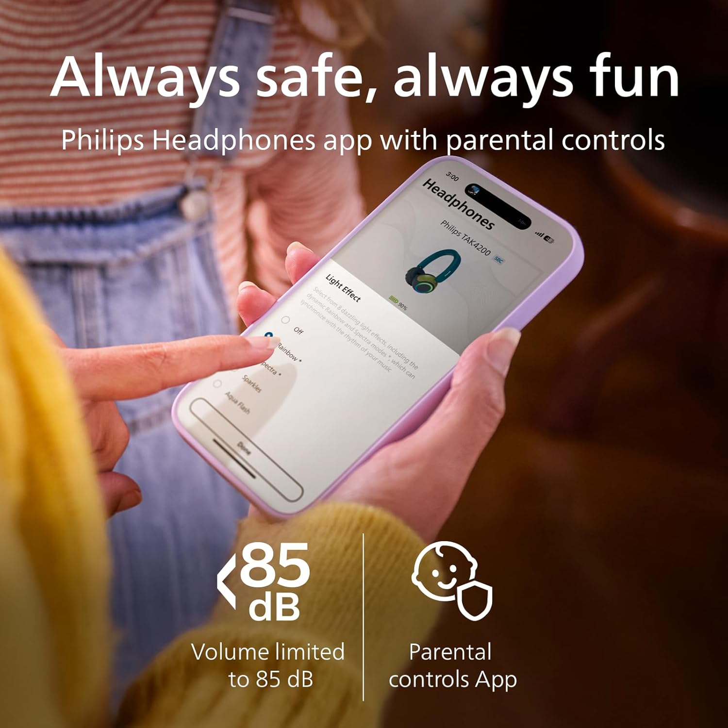 Designed with 85 dB volume limiting technology to help protect children’s hearing while they enjoy music, cartoons and educational content.