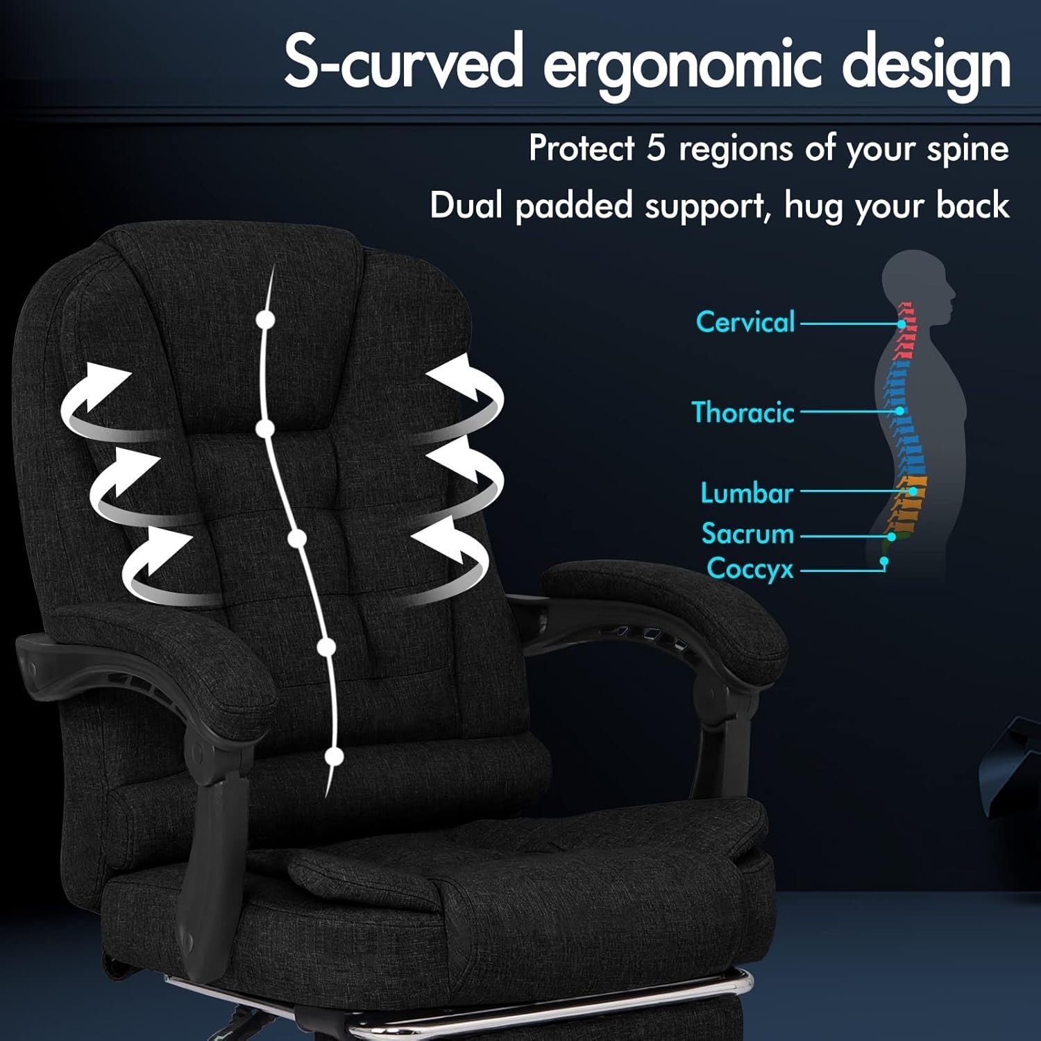 Upgrade your work-from-home setup with the ultimate Linen Fabric Massage Office Chair . This executive chair is designed for all-day comfort and support , perfect for home offices and serious gaming. Relieve back pressure and muscle pain with the 2-point massage zone and 3 intensity modes focusing on 5 regions of your spine. The S-curved backrest and cushion back provide professional, ergonomic support that makes sitting a pleasure.