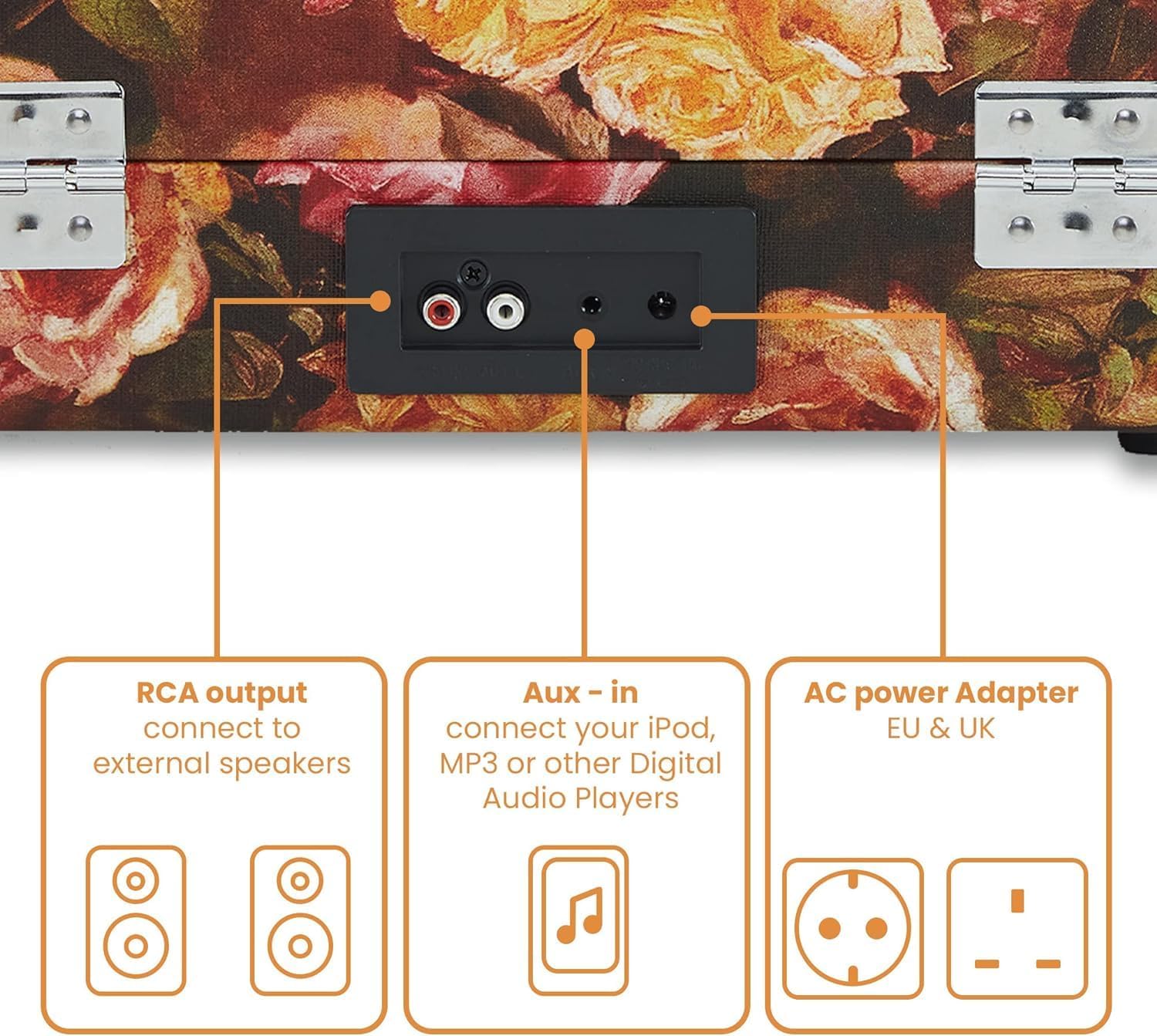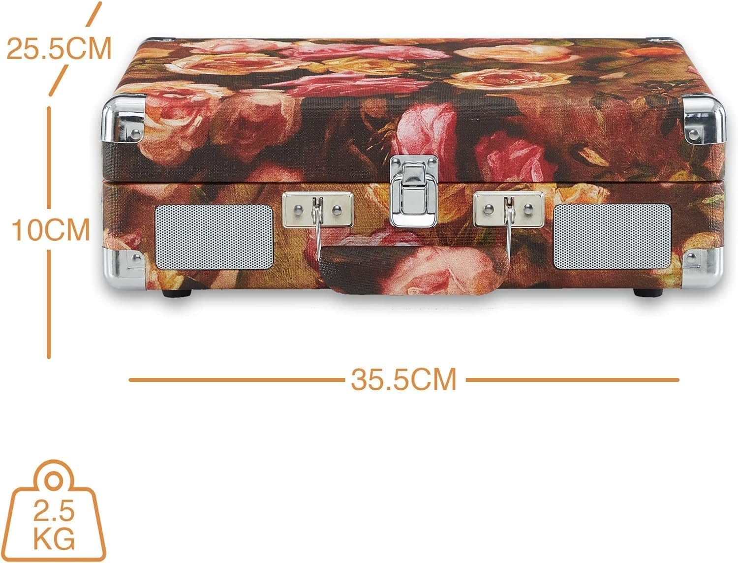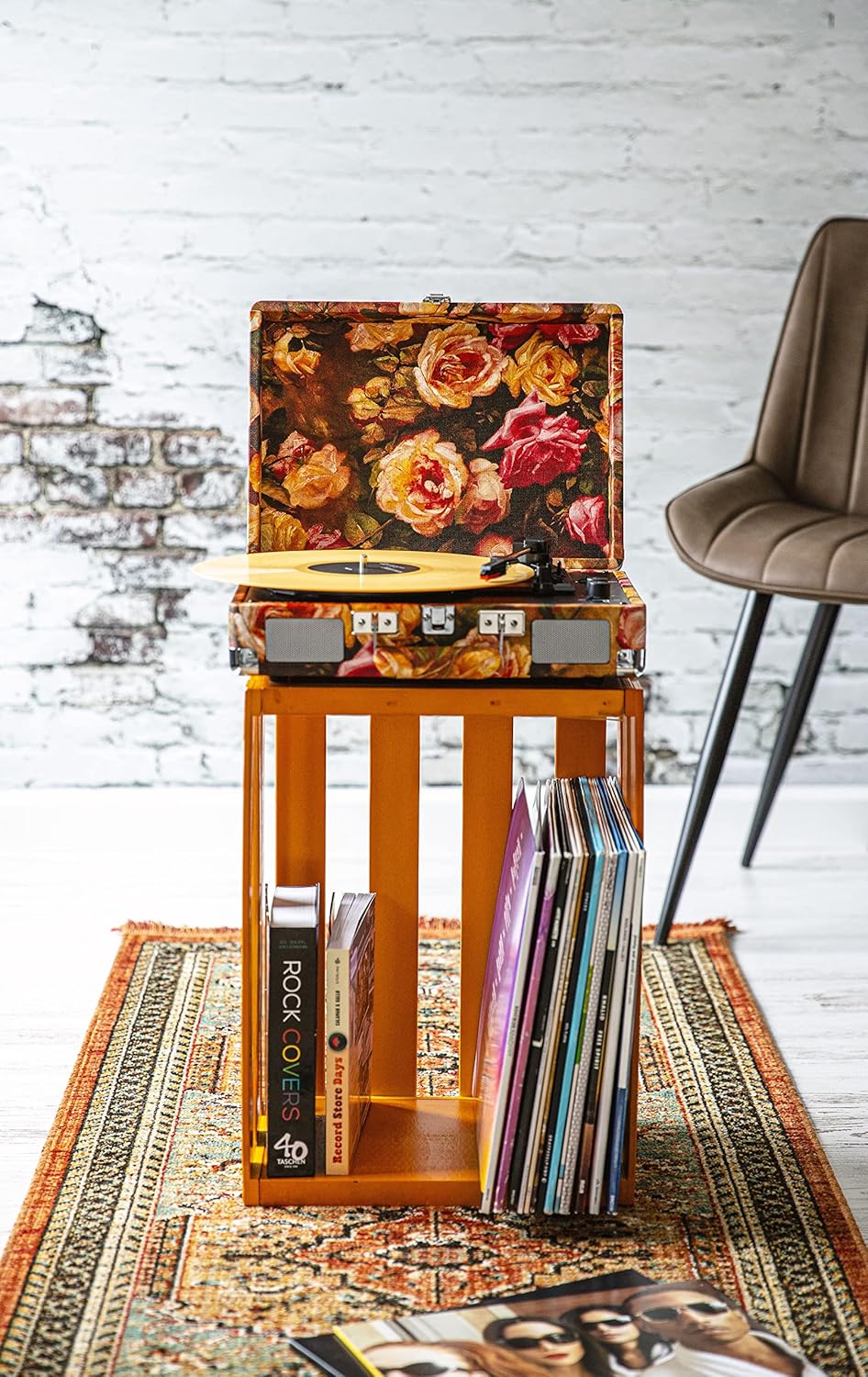 The floral suitcase finish with carry handle allows you to take your turntable anywhere. Lightweight and compact, it doubles as a decorative accent while keeping your vinyl collection accessible.