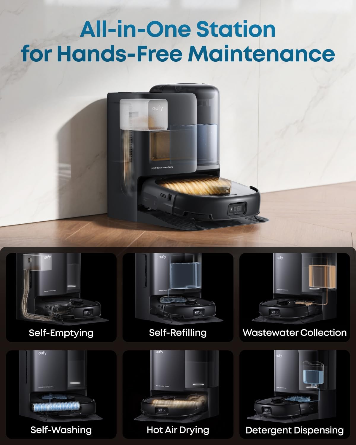 Automatically empties dust washes and dries mop pads for true hands free cleaning.