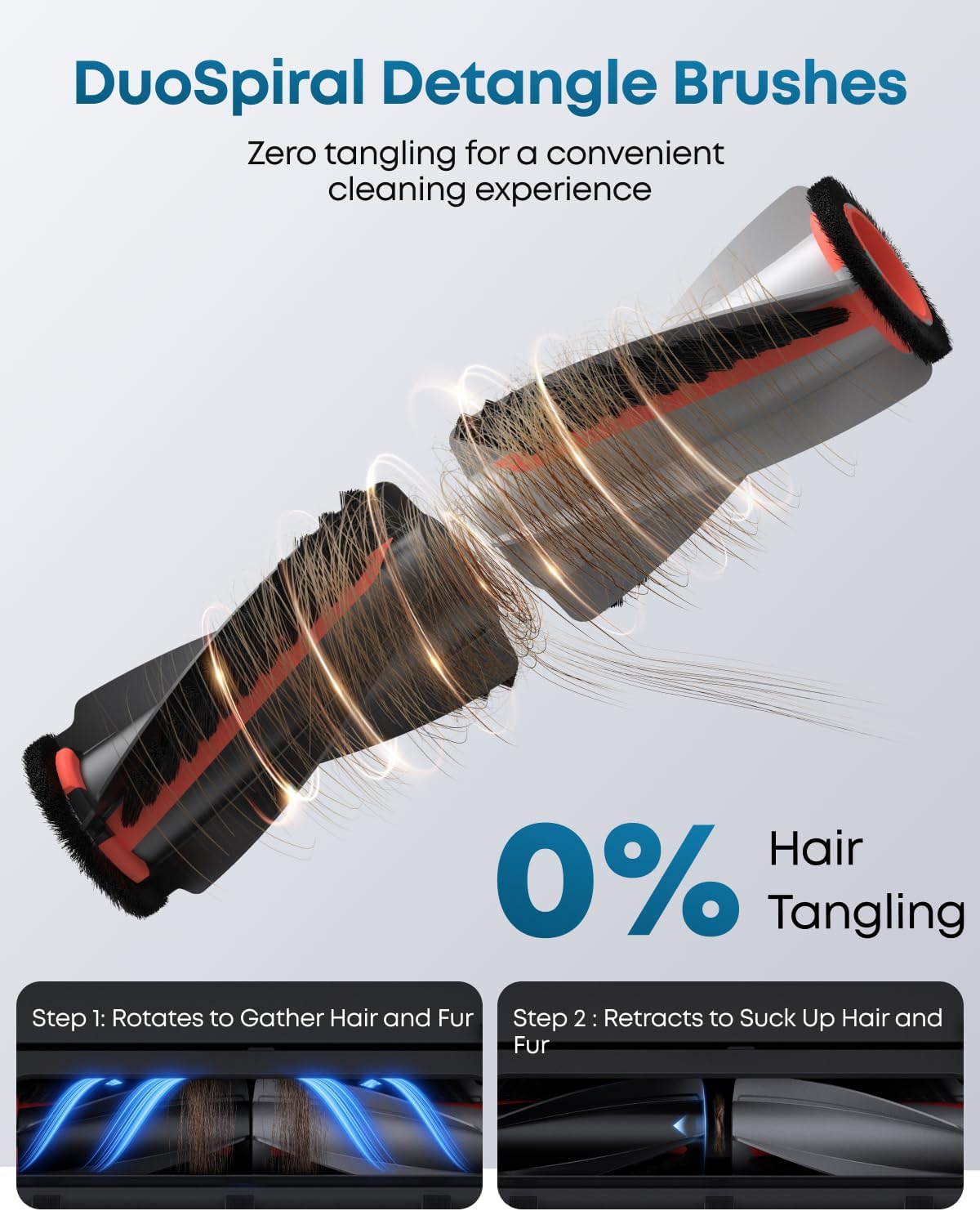 Dual spiral brushes prevent hair wrapping reducing maintenance and improving performance.