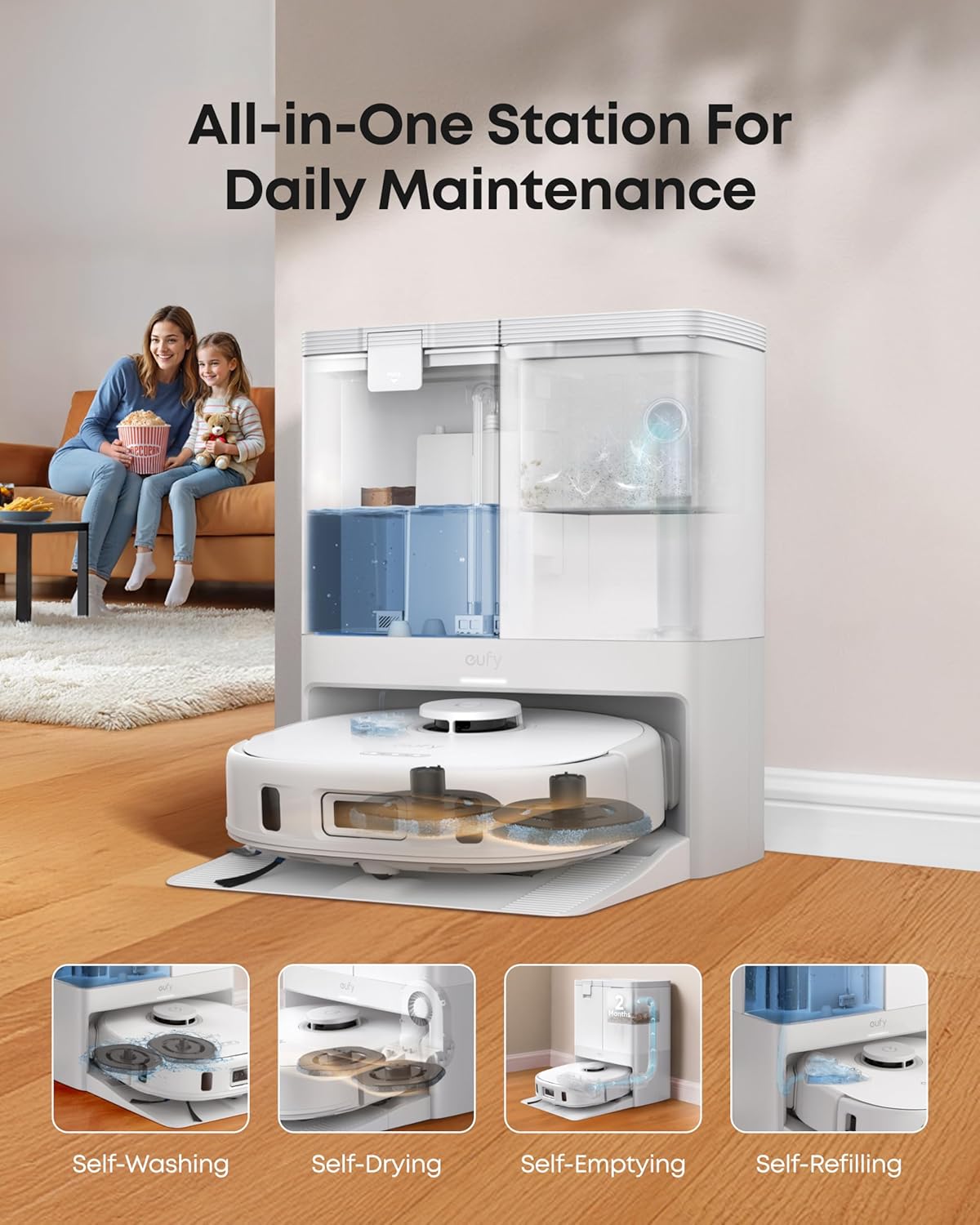 Automatically empties dust, washes and dries mop pads with heated air, and refills water—giving you a completely effortless cleaning experience.