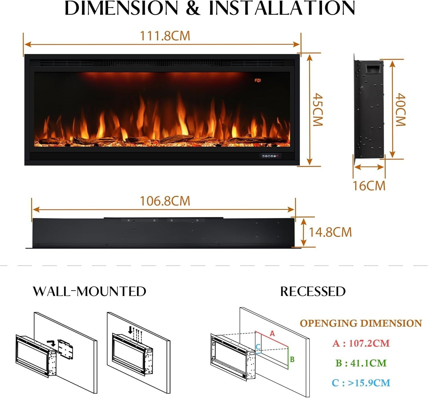 Save floor space with this sleek, recessed electric fireplace that fits flush into your wall. Easy to install with included mounting bracket, ideal for modern homes, apartments, or offices.