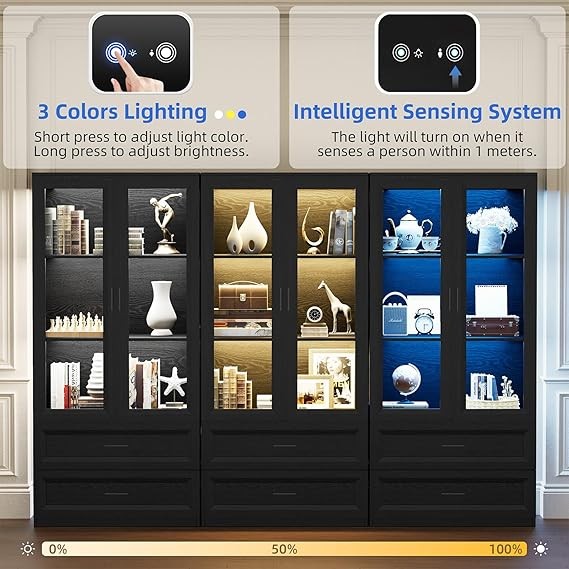 Transform your space with this premium 67" tall black display cabinet — perfect for showcasing collectibles, décor, books, or luxury ornaments. Its elegant glass doors, LED lighting, and drawer storage make it ideal for living rooms, bedrooms, home offices, and kitchens.
