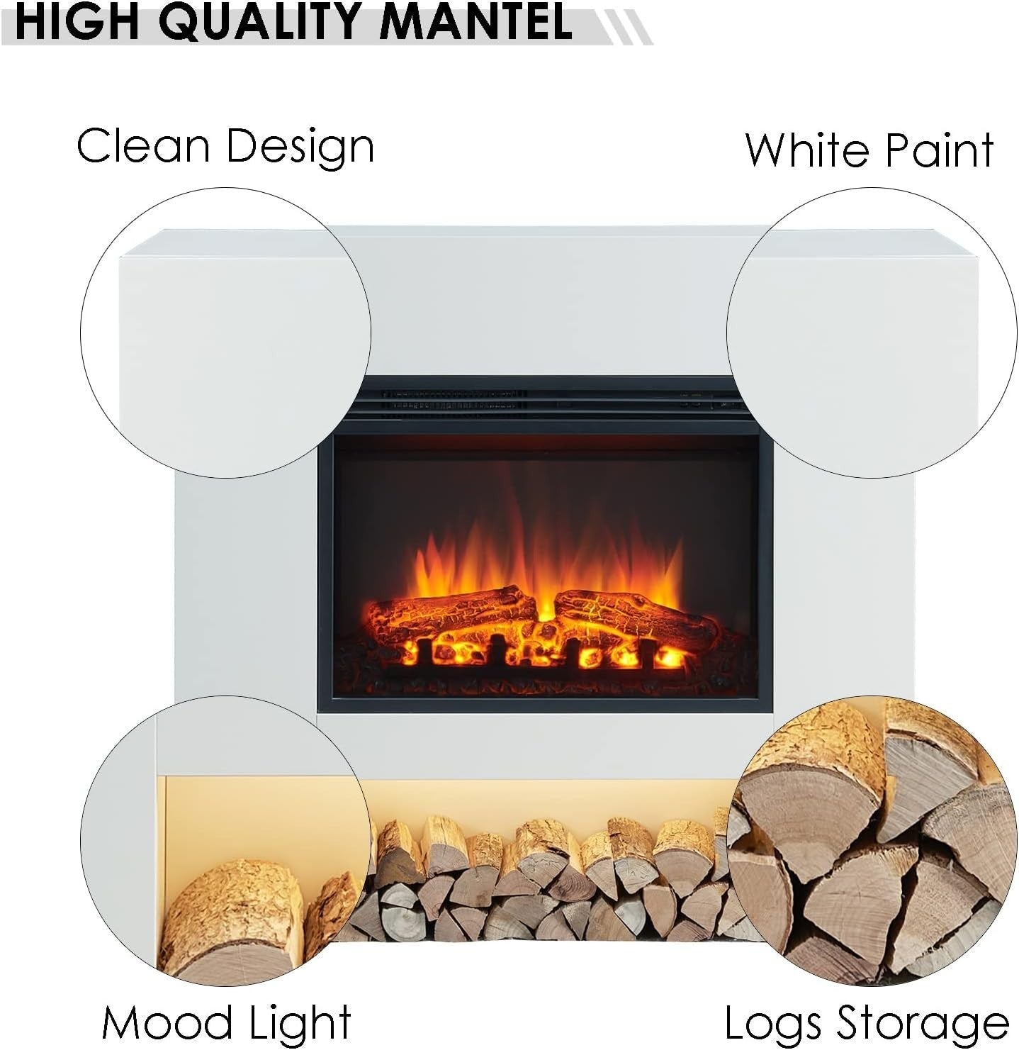 White Electric Fireplace Suite Heater 2kW Log Storage Flame Effect