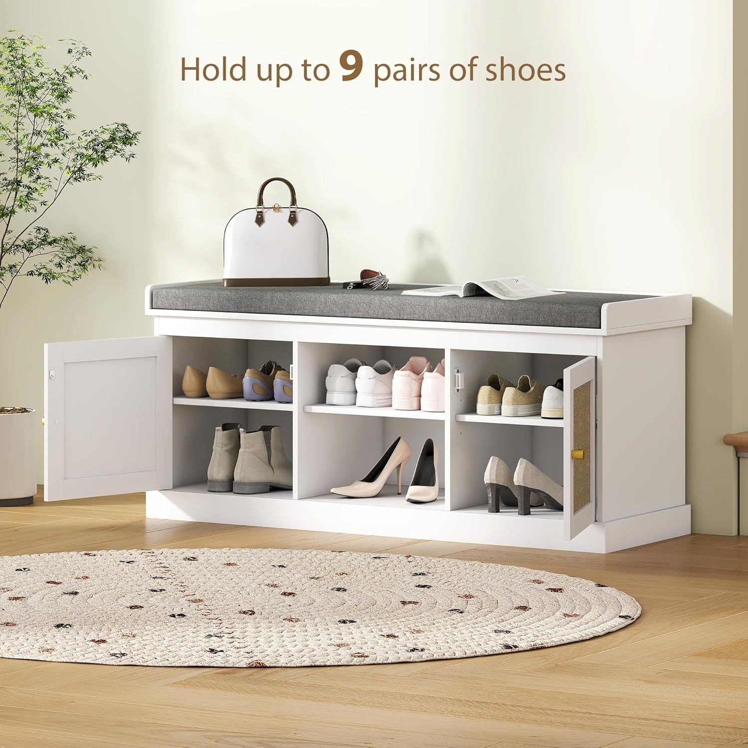 White Shoe Storage Bench with Cushion, Rattan Doors, 9 Pair Rack, Hallway Seat